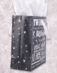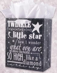 Bring a smile to their face with this chalkboard style bag with the children's nursery rhyme "Twinkle, twinkle little star". This Garden Size (10" x 12") matte finish bag has glitter accents and a white grosgrain handle. Pair it up with our Music Score (T-310) or Star Celebration (T-090) scalloped tissue paper collections for that perfect finishing touch.