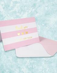 Our Very Very Much note cards are printed on a white uncoated stock, with gold foil accents and a light pink envelope. These note cards are packaged in a set of 14. Great for you personal note writing or as a thoughtful gift.