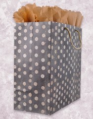 Right on trend, large kraft color dots on a distressed background, our Washy Spots Dark gift bags work great for any age and any occasion. Keep it simple, or add a burst of color with our Kraft Dots (T-337) or Cocoa Stripe (T-215) scalloped tissue paper collections. The Square Jumbo (15" x 15" x 7") has a kraft finish and a natural color rope style handle.