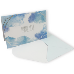 Our Watercolor Dream thank you note cards are printed on a premium white uncoated stock with silver foil accents. Includes matching light blue envelopes. These note cards are packaged in a set of 16. Great for your personal note writing or as a thoughtful gift.