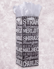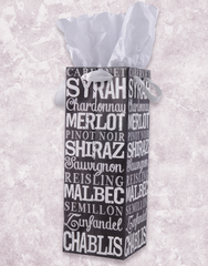 Trendy chalkboard style background listing of popular wines will delight the wine connoisseur on your list. This wine size (4.875"W x 13.5"H x 4.875"D) is printed on white kraft stock and has a white grosgrain ribbon handle. Dress up your gift with our metallic Shiny Shiny (T-058) or add a pop of color with Maison Colors (T-315) scalloped tissue collections.