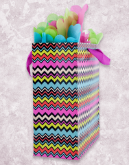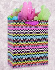 This hot, trendy bag will be a show-stopper whatever the occasion. Give your special gift to your friend or loved one in our dynamic Zig for a Zag Gift Bags and show off your chic style! This garden size (10" x 12" x 5"), matte finish bag features varnish accents and a pink grosgrain ribbon handle. Add our Chevron Rainbow Scalloped Tissue Paper (T-265) collection for the complete gift presentation!